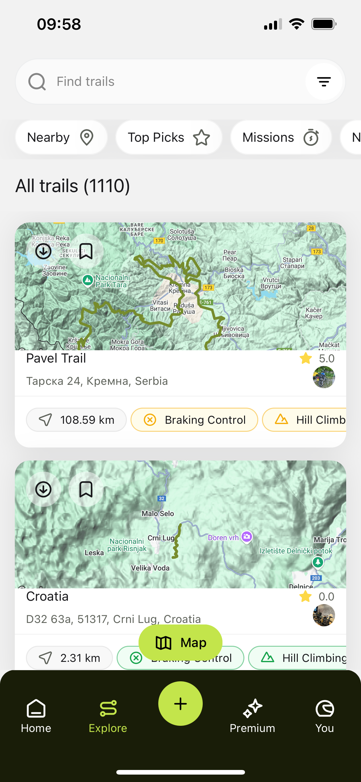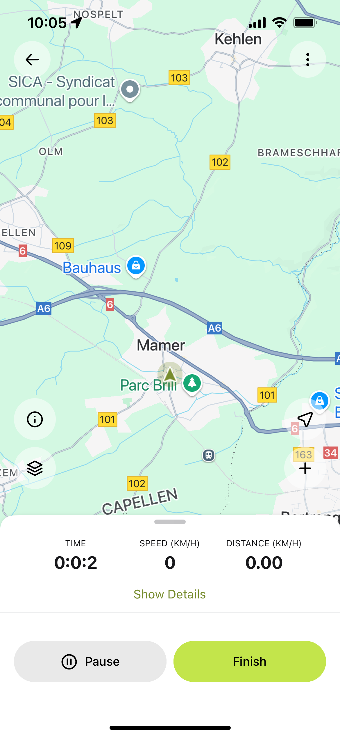 Touren registrará automaticamente sua trilha em tempo real, exibindo estatísticas chave da sua rota: